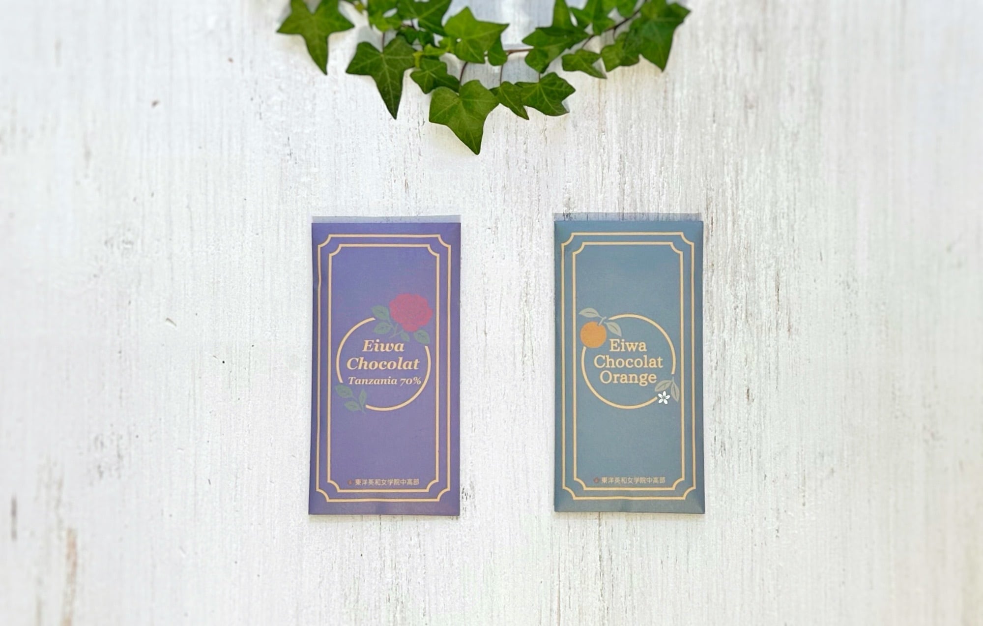 パッケージは『Eiwa café』『2゜Eiwa café』を描いた卒業生の方にデザインしていただきました。裏面のフタ部分は制服の襟をモチーフにしています。