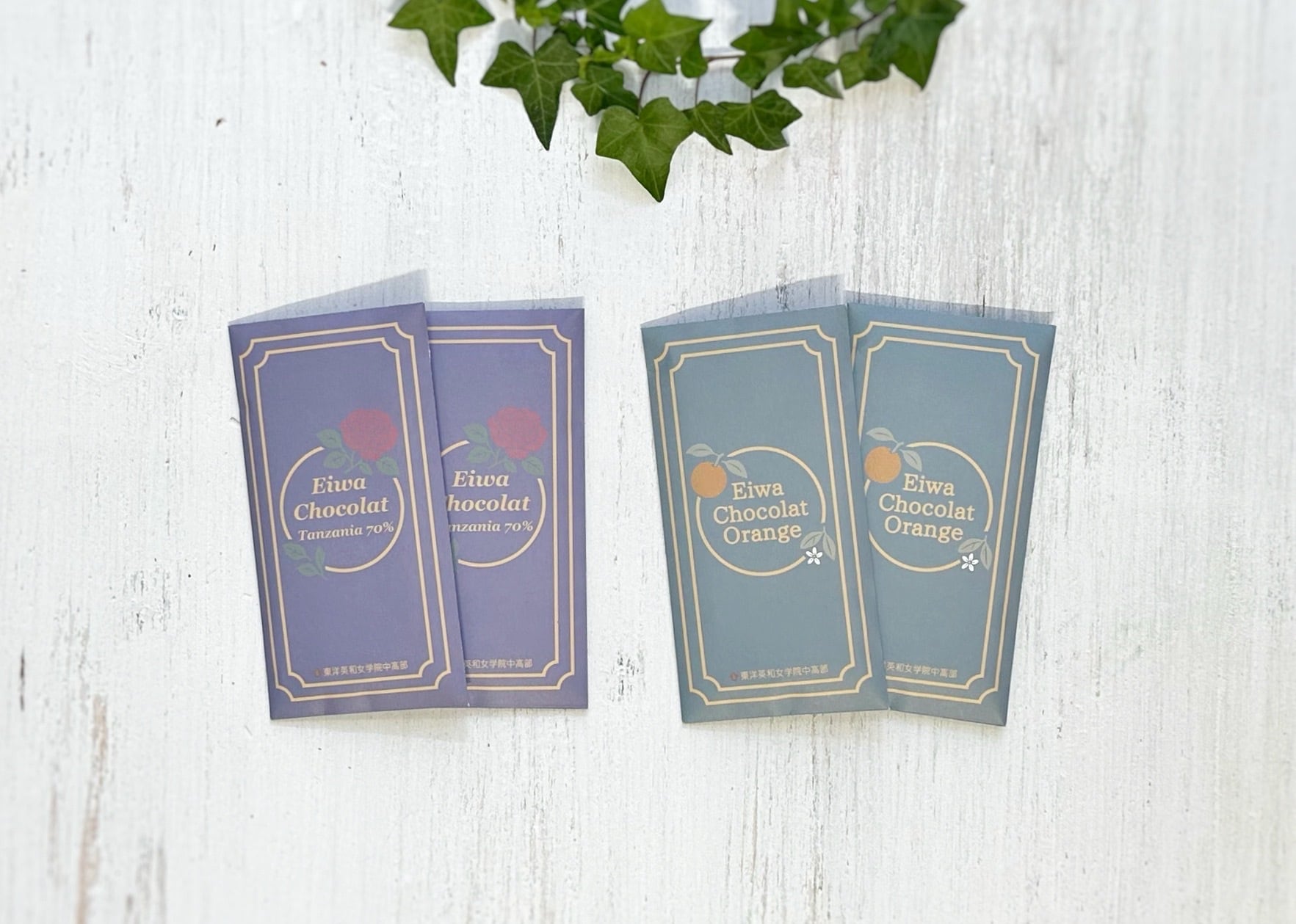 パッケージは『Eiwa café』『2゜Eiwa café』を描いた卒業生の方にデザインしていただきました。裏面のフタ部分は制服の襟をモチーフにしています。