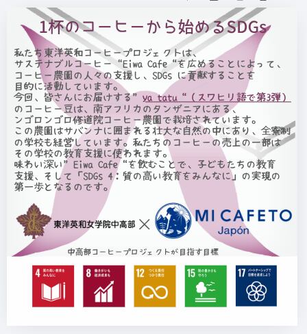 『Eiwa Café -ya tatu-』のコーヒー豆「ンゴロンゴロ」はタンザニアのンゴロンゴロ修道院コーヒー園で栽培されたものです。売上の一部は、修道院が経営している全寮制女子校に通っている子どもたちの教育支援をしています。この豆を使った『Eiwa Café -ya tatu-』を楽しむことが、子どもたちの主体的な学び・自由な進路選択の実現、そして、「SDGs4:質の高い教育をみんなに」の実現の第一歩となるのです。あなたも一杯のコーヒーから、SDGsに協力しませんか?