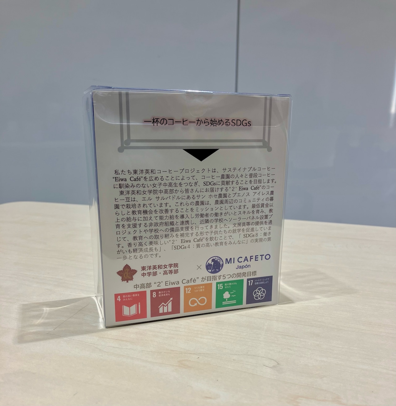 『2°Eiwa Café』のコーヒー豆「ブルボン エリテ」は、”エル サルバドル”のホセ農園とブエノス アイレス農園で栽培されたものです。この2つ農園は、農園周辺のコミュニティの暮らしと教育機会を改善することをミッションとし、活動を行っています。この豆を使った『2°Eiwa Café』を楽しむことが、子どもたちの主体的な学び・自由な進路選択の実現、そして、「SDGs4:質の高い教育をみんなに」の実現の第一歩となるのです。あなたも一杯のコーヒーから、SDGsに協力しませんか?